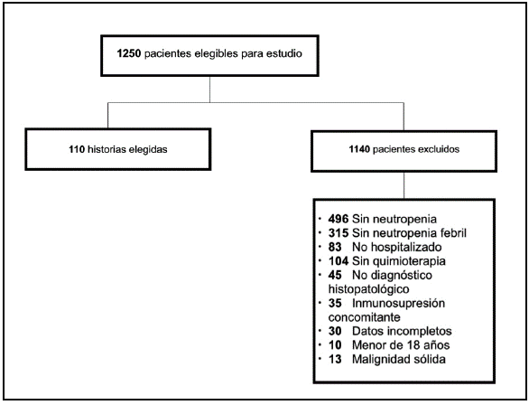 An observational, descriptive, retrospective cohort study was performed on adult patients over the age of 18 with hematologic malignancies coded at discharge with ICD-10: C810-C960 codes (pertaining to malignant tumors of lymphatic tissue, hematopoietic organs and associated tissues), who received hospital treatment at the Hospital San Vicente Fundación in the city of Medellín between January 2013 and December 2016. Of these, the episodes (each hospitalization was considered to be a separate episode, regardless of whether the patient had already been included in the study due to a prior hospitalization) in which patients developed febrile neutropenia after chemotherapy were selected. Data was collected from the electronic medical records. The researchers did not participate in the care of these patients.