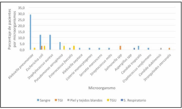 The main microorganisms wereK. pneumoniaein 30% of isolates (n=20) (19 bacteremias and one urinary tract infection),E. coliin 18.4% of isolates (n=12) (eight bacteremias, two gastrointestinal tract isolates from intra-abdominal abscess aspiration, and two urinary tract infections), andS. aureuswith bacteremia in eight of the isolates (12%).