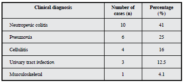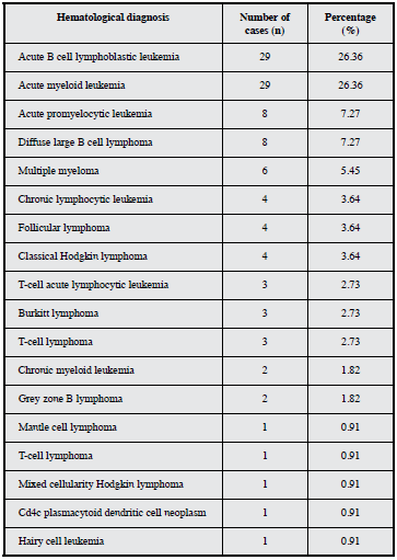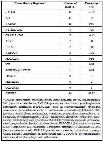Of the 110 episodes included, 50.9% (n=55) of the patients were male, with a mean age of 45 years, IQR 33 (Q1 26-Q3 55). The main hematological diagnoses were acute lymphocytic leukemia (n=29, 26.3%), acute myeloid leukemia (n=29, 26.3%) and lymphomas (n=27, 24.5%) (Table 1). The main chemotherapy regimens received were, in order from greater to lower frequency, CALBG (cyclophosphamide, daunorubicin, vincristine, prednisolone, pegaspargase) (n=19, 17.27%), 7 + 3 regimen (cytarabine, idarubicin) (n=11, 10%) and R-CHOP (prednisone, vincris-tine, cyclophosphamide, doxorubicin, rituximab) (n=10, 9.09%) (Table 2). An average number of days elapsed from the last chemotherapy session to a neutropenia diagnosis was established at nine (range 3-33 days), differentiated according to the main malignancy groups: acute myeloid leukemia: nine days: acute lymphocytic leukemia: nine days; lymphomas: nine days, and plasma cell neoplasms: 10 days. The crude inpatient mortality was 17% (n=19). With regard to clinical diagnoses, 25.8% (n=28) had no suspected site, 24.5% (n=27) had primary bacteremia and 19% (n=21) had pneumonia (Table 3).