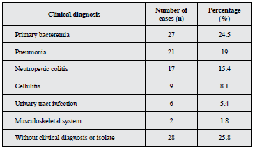 The microbiological findings showed that in 55.4% of the febrile neutropenia episodes which occurred between January 2013 and December 2016, a microbiological agent responsible for this clinical picture was isolated; regionally, microbiological diagnoses range from 41 to 66% of cases 21. The two clinical foci with the greatest contribution to microbiological isolation were urinary tract infection (11%) and bacteremias (83%), which differs significantly from most local, regional and global studies where bacteremia only contributes 20-30% of the findings 12. The sites presumed to be the source of the infection leading to bacteremia are the gastrointestinal tract, respiratory tract, genitourinary tract and skin 10, which coincides with our findings.