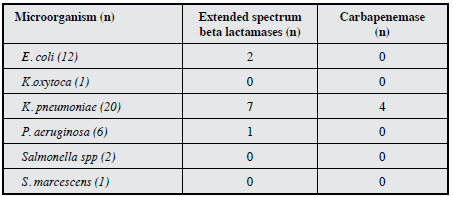 With regard to the resistance pattern (Table 5), 23.8% of the gram-negative bacilli had ESBL (n=10), of which 60% (n=6) had received antibiotics within the previous 30 days (33.3% had received quinolones and 66.6% betalactams). In addition, 9.5% (n=4) of the isolates with gram-negative bacilli had carbapenemase production. Of these, 100% (n=4) had been exposed to antibiotic treatment within the previous 30 days (100% carbapenems: 75% piperacillin/tazobactam and 25% quinolones).
