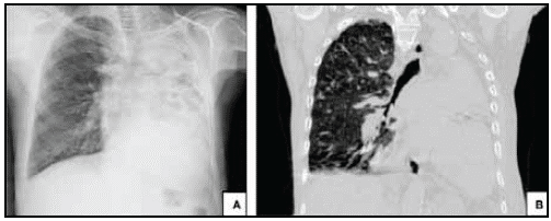 (A) AP chest x-ray showing diffuse heterogenous radiopacity of the left chest with associated ipsilateral loss of volume. Radiografía de tórax en proyección P-A. Evidencia radiopacidad difusa heterogénea del hemitorax izquierdo asociada perdida de volumen ipsilateral. (B) Coronal high-resolution CT in lung window projection showing loss of volume in the left lung with consolidation and varicose bronchiectases.