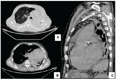 Chest computerized tomography image using an axial lung window. (A) and a mediastinal window; (B) sagittal mediastinal window; (C) showing left pleural thickening and calcifications. Free right pleural effusion. Mediastinal adenopathies. Cardiomegaly and precapillary pulmonary hypertension showing loss of left lung volume with consolidation and varicose bronchiectases.