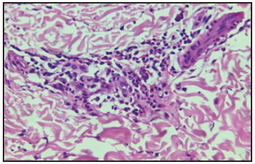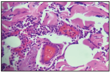 Given the clinical characteristics, his age group and the results of the paraclinical exams, an ophthalmology consult was requested. This consult proposed left eye neuropathy, and polymyositis was ruled out as the cause since the Bohan and Peter criteria were not met (there were no skin lesions, there was clinical improvement with the use of steroids, there were normal muscle enzymes and there was no myopathic pattern on the EMG), suggesting small fiber neuropathy. Thus, additional treatment was begun with pregabalin and vascular and muscular biopsies were performed (Figures 1and2) which confirmed the diagnosis of polyarteritis nodosa (PAN) with the finding of mixed inflammatory infiltrate (predominantly polymorphonuclear cells, lymphocytes and histiocytes), and meeting five of the 10 ACR criteria for PAN. With these results, treatment was begun with cyclophosphamide (six cycles of 1 gr diluted in 250 cc of NS), oral prednisone 1 mg/kg/day, oral azathioprine (50 mg every 12 hours), and folic acid (1 mg/day). A favorable progression was seen with this regimen, the treatment objectives were met, and the patient was discharged with an order to return once a month for the cyclophosphamide cycles.