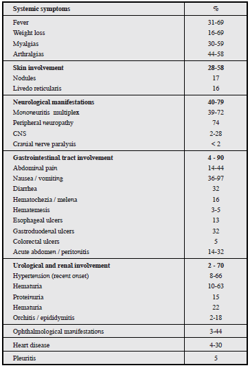 The symptoms are very heterogeneous since the arterial inflammation may affect a single organ or even, in more severe cases, lead to fulminant multiorgan failure, thus involving several systems and creating a wide constellation of clinical manifestations, which will depend mainly on the number and location of the affected arteries. The frequency of the clinical manifestations of polyarteritis nodosa is described inTable 15,6.