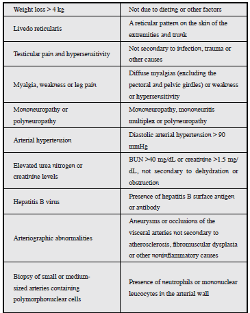 The diagnosis is based on the criteria established in 1990 by the Chapel Hill Consensus and the American College of Rheumatology (ACR), which have only been validated in adults (Table 2) 7. The presence of three or more criteria has a sensitivity of 82.2% and a specificity of 86.6% 7-9.