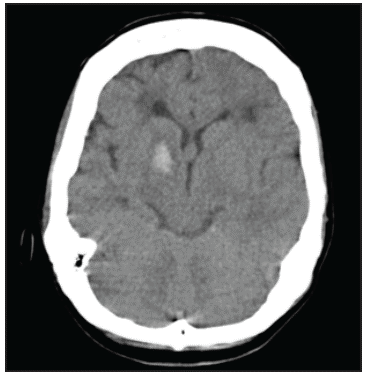 In our case, moyamoya disease presented as a first generalized seizure with subsequent recovery, without apparent motor or cognitive deficits, caused by an intraparenchymal hemorrhage in the right basal nuclei detected through a simple cranial CT. This finding matches the literature which mentions that intraparenchymal hemorrhage is more common than the intraventricular or subarachnoid forms in patients with this disease, and that the most common locations are the basal nuclei, the medial temporal lobe, and the thalamus 1,4.