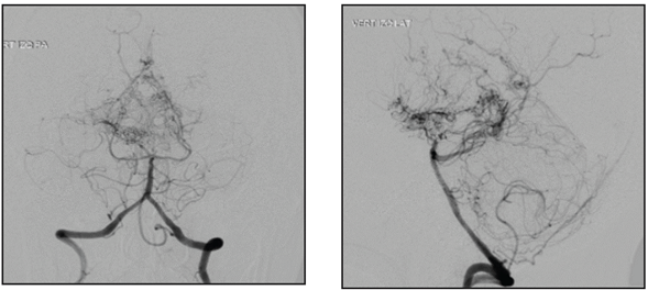 A 45-year-old female, ethnically mestizo patient with no significant past medical history was admitted to the emergency room of a quaternary hospital in the city of Cartagena (Bolívar) on July 1, 2019, due to a one week history of moderately intense holocranial headaches and a subsequent generalized tonic-clonic seizure, with sphincter relaxation and an unspecified length of the seizure. On admission to the emergency room, her blood pressure was 140/90 and the rest of her vital signs were normal with no focal neurological deficits. A simple computerized tomography (CT) of the head showed intraparenchymal hemorrhage in the right basal ganglia, mild multifocal small vessel ischemic disease, malacic changes in the right occipital region and an old left frontal ischemic event adjacent to the left lateral ventricle (Figure 1). The initial lab exams showed no abnormalities, with normal red and white blood cell and platelet counts, and nitrogen compounds, electrolytes and coagulation times all within normal limits. Cerebral panangiography found thinning of the internal carotid and posterior cerebral arteries (the latter seen in 50% of cases) with abnormal neovascularization in the basal nuclei, compatible with moyamoya disease (Figure 2). With these results, her possible treatment plan was assessed by a neurosurgery medical panel, concluding that she could benefit from endovascular treatment. However, in light of the high risk of recurrent bleeding, this procedure was postponed for at least four weeks.