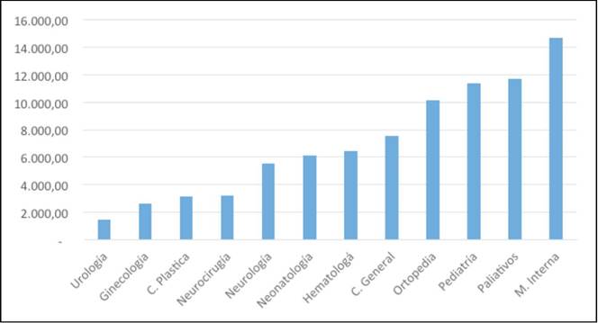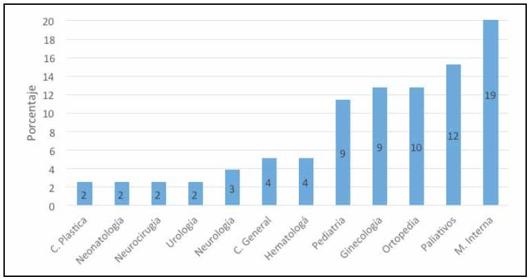 Las especialidades más afectadas fueron: medicina interna 24.1%, cuidados paliativos 15.2%, ortopedia 12.6% y ginecología 11.3%, aunque en términos generales afectó a múltiples áreas de atención, pero en menor proporción (Figura 2). Mencionamos además que los pacientes afectados, ninguno de ellos tuvo un evento adverso durante este periodo.