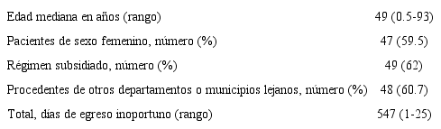Durante los tres meses analizados se encontraron 79 pacientes con egreso inoportuno de origen no médico de un total de 3273 egresos, correspondiente al 2.4% (Tabla 1). Predominaron las mujeres con 59.5% de los casos. La mediana para la edad fue de 49 años, con un rango amplio desde seis meses hasta 93 años. La mayoría de los pacientes eran del régimen subsidiado con 62-60.4% eran procedentes de otros departamentos o municipios lejanos. El total de días de hospitalización de los pacientes fue 1989, con un aporte en días por egreso inoportuno de 547 (correspondió a 27.5% de la estancia) con un promedio de estancia inoportuna de 6.6 días por paciente.
