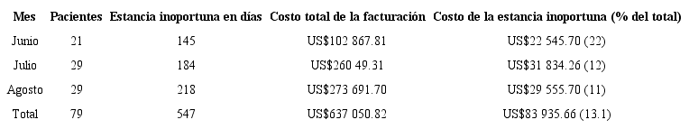Material y métodos: estudio observacional, retrospectivo. La definición operativa de egreso inoportuno correspondía a pacientes que desde el punto de vista clínico podían ser dados de alta, pero continuaban ocupando una cama por problemas no médicos. Los datos fueron tomados de las historias clínicas y para el análisis de costo, se tuvieron en cuenta el total de los costos generados por la estancia inapropiada, incluyendo el costo día de hospitalización, insumos, medicamentos y evaluaciones médicas. La perspectiva del costo fue desde el pagador.
