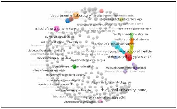 Se realizó también la distribución de los artículos según cada país, resultados que se encuentran en laTabla 4. Mediante el programa VOSviewer se correlacionaron las palabras claves de los artículos con un mínimo de dos ocurrencias, se extrajeron las correlaciones de las"keywords"de los artículos en lasFiguras 1y2, se reporta la correlación de términos reportados en elabstract,de esta forma se reporta visualmente cuáles son los términos o conceptos en los que están centrados las investigaciones de COVID-19. Por otro lado, se realizó la correlación de las revistas en donde se han publicado los artículos, con un mínimo de dos ocurrencias encontrando los resultados de laFigura 3.