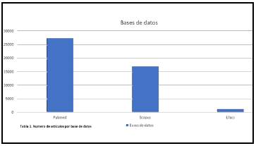 En el periodo de 1°. de diciembre de 2019 a 30 de junio de 2020 se encontraron un total de 45 400 artículos sobre COVID-19 y/o SARS-CoV-2 para las tres bases de datos. En laTabla 1se muestra la distribución de estos artículos según la base correspondiente así: Pubmed 27 373 artículos, Scopus 16 944 y Lilacs 1083 artículos.