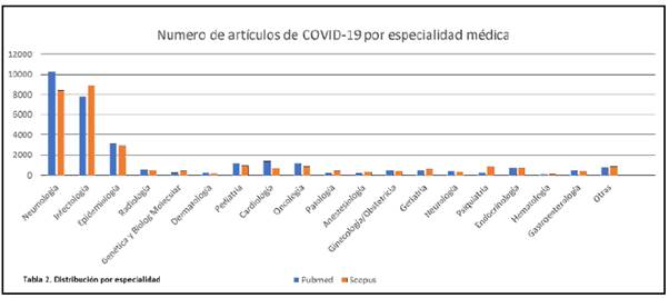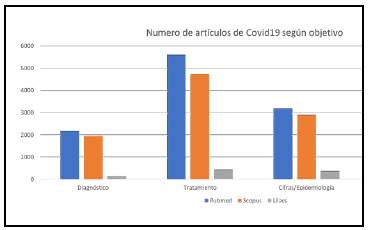 Resultados: se encontraron 27 373, 16 944 y 1083 publicaciones acerca de COVID-19 en Pubmed, Scopus y Lilacs respectivamente. La principal especialidad médica por búsqueda fue neumología. De acuerdo con el objetivo, el más encontrado fue tratamiento (50.0%). El país con más publicaciones fue Estados Unidos (28.9%) en Pubmed y Scopus. En el lapso COVID-19 las publicaciones de la enfermedad representan 0.06 del total.