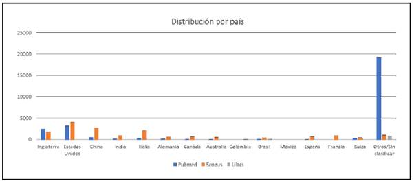 La distribución por país se realizó en las tres bases de datos, con 19 192 artículos en Pubmed que no se pudieron clasificar. Se encontró que los países con mayor volumen de publicación fueron Estados Unidos con 28.9%, Inglaterra 17.2%, seguido de China con 12.7% e Italia 10.1%. En Lilacs base latinoamericana, los países con mayor participación fueron Brasil 43.5%, Colombia 28.7% y Perú 10.3%