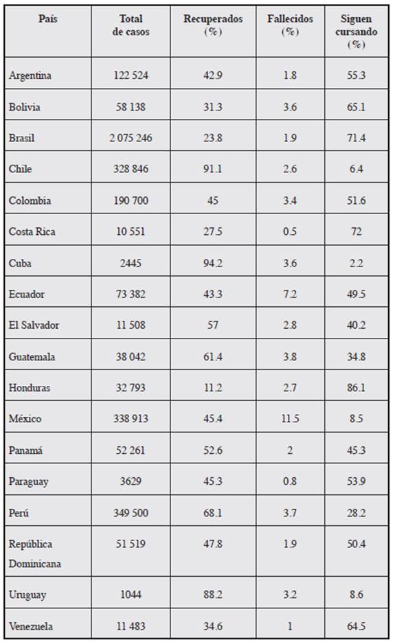 Y solo superados en Latinoamérica por Brasil que ocupa el segundo puesto a nivel mundial con 1 233 147 infectados, 55 054 fallecidos y 673 729 recuperados. En laTabla 1se observan las cifras en Latinoamérica al 18 de julio de 2020.