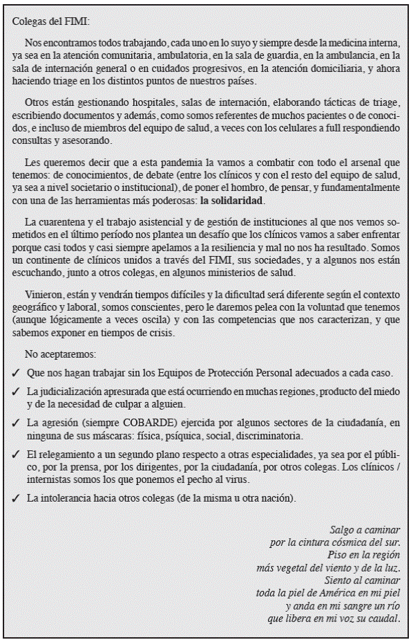 A su vez, se transcribe el mensaje de las autoridades del FIMI para todos los colegas latinoamericanos (Anexo 3).