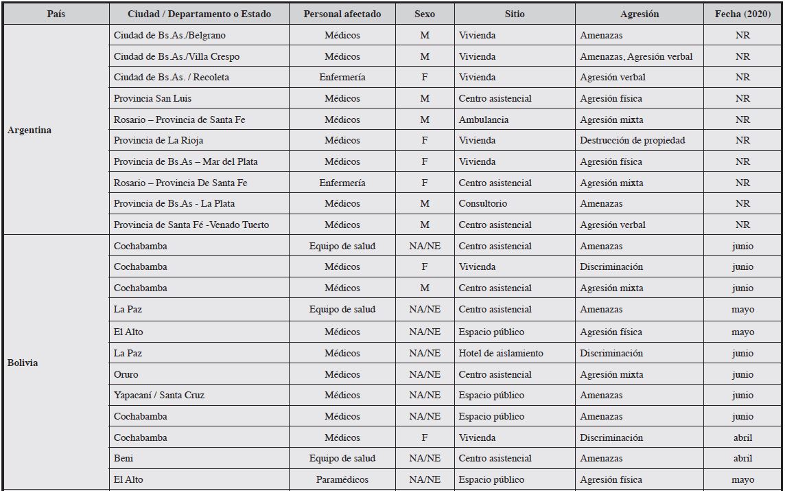 En Bolivia, mediante encuesta realizada sobre agresiones al personal de la salud, se encuentra que de 184 respuestas, 77.2% respondió afirmativamente haber sufrido algún tipo de agresión, principalmente en mujeres. La mayoría de agresiones ocurren a los médicos (72%), en los centros asistenciales y saliendo al trabajo/camino al trabajo. Entre los principales tipos de agresión, los encuestados respondieron la agresión verbal, seguida de la discriminación, la violencia física y las amenazas de muerte. En 8.3% de dichas agresiones hubo necesidad de acompañamiento de la policía, pero solo en 42% de los casos hubo denuncia respectiva. El 94% de los encuestados conoce de otras personas del personal de salud que han resultado afectadas.