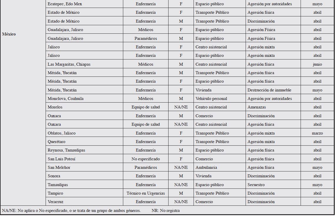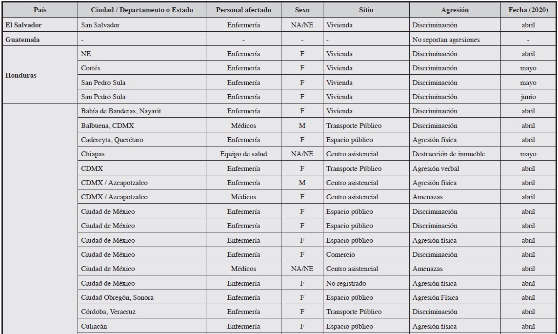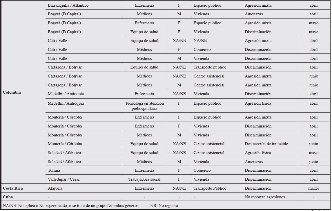 Cuando se recopilan datos informativos publicados en la prensa en Latinoamérica, puede observarse que los casos de discriminación o violencia contra el personal de salud han ocurrido en muchos países además de Colombia, registrando al menos 111 casos repartidos así: México: 40, Colombia: 20, Argentina: 10, Venezuela: 9, Paraguay: 8, Honduras: 4, Panamá: 4, Perú: 2, Costa Rica: 1 y El Salvador: 1 (Anexo 1). El 45% de los casos de discriminación o violencia han ocurrido en mujeres mientras que 28% han ocurrido en hombres. El 40% de los casos de discriminación o violencia ocurren contra médicos, 40% contra enfermeras y auxiliares de enfermería 31 y 11% ocurren contra varios miembros del equipo de salud de manera simultánea.