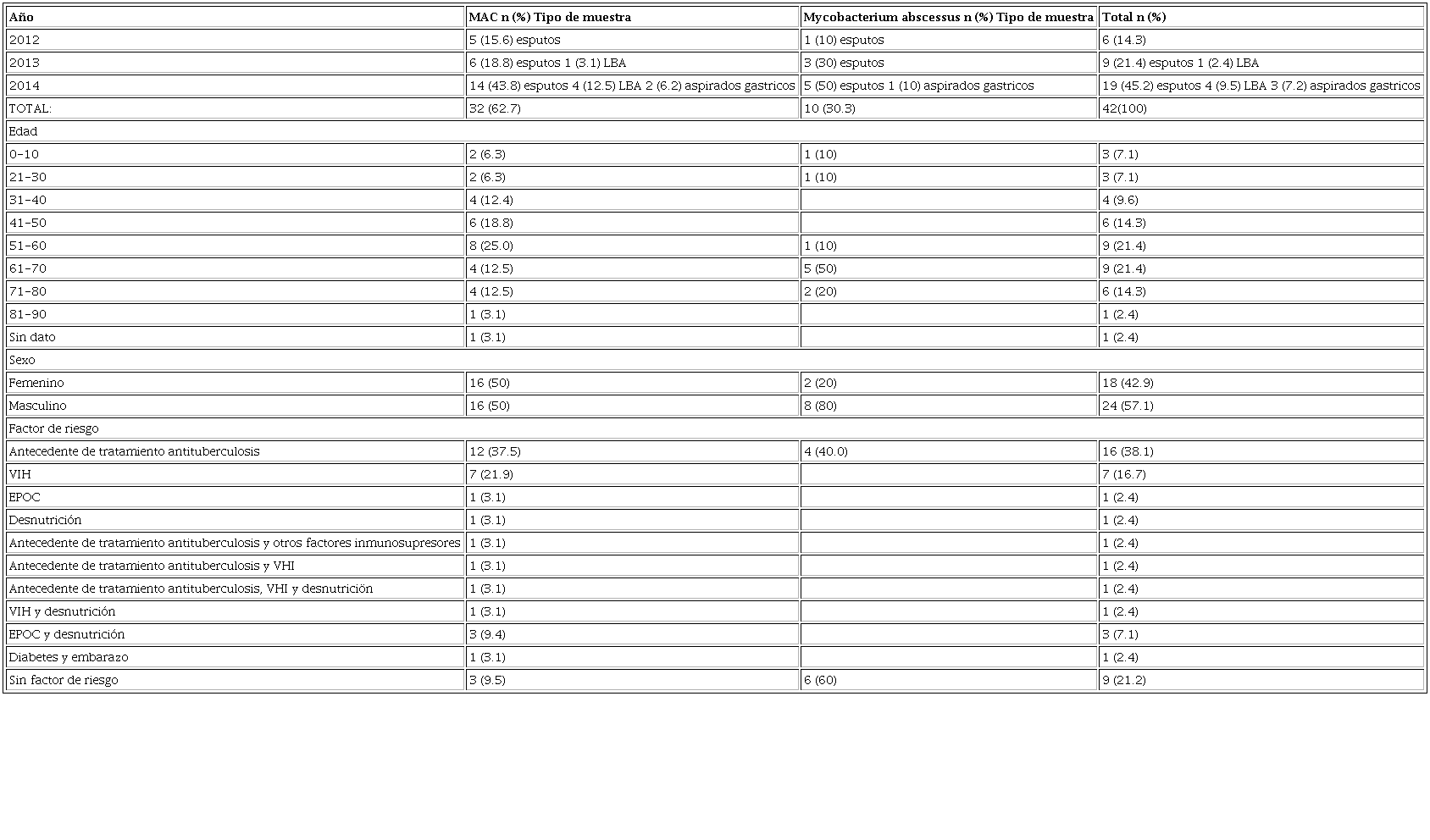 Materials and Methods: a case series study of 42 individuals to whom Mac and M. abcessus were isolated from pulmonary samples that were identified by phenotypic and genotypic tests, was carried out. The source of information was the unique format of surveillance of mycobacteria that is received with each of the isolates that come to the National Health Institute. The variables age, sex, type of sample and presence of risk factors were analyzed.