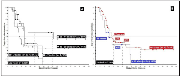 The analysis by decades shows better outcomes for the under 45 and 45-55 year-old groups, who were the only ones to achieve five-year survival rates of 61% and 22%, respectively, with no statistical difference (p=0.1924).