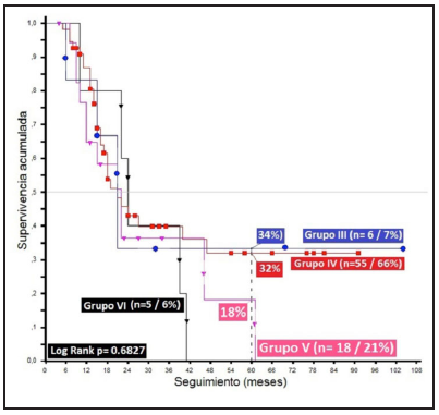 According to the RPA classification, there is an inverse relationship between survival and RPA, with a 14% difference at five years between the group with a good prognosis (III-IV) and the groups with greater adverse factors (V-VI) (p=0.6827), similar to what has been reported by other researchers, showing the importance of this classification for future research projects 4,9,16. There were better survivals than those of Wang Li J (2011), who reported 70, 46 and 28% at 12 months, compared to 84, 80 and 65% in the current study in the same period analyzed for Groups III, IV and V, respectively, without statistically significant differences (Figure 3).