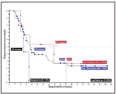 There are three overall objectives in surgical treatment: taking a sample for histological diagnosis, decreasing or relieving symptoms, and improving survival. Our results have an uncertain interpretation, since 79% underwent partial resection (PRes), and 9% had a biopsy (Bx), with non-statistically significant treatment outcomes (p=0.2902), but with differences in median survival of 7 and 32 months comparing Bxs to greater resections 17 (Figure 4).