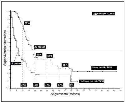 Results: one hundred ninety-three patients with glioblastoma; 84 (44%) received standard Stupp platform treatment; mean age 54 years; 55% males; mean tumor size 28,793 mm2; 48% right hemisphere; 21% crossed the midline; 33% had seizures and 42% neurological deficit; 55% Karnofsky less than 70% and 66% RPA IV classification; 77% received radiation with 60.00 Gy or more; 19% had complications; 79% partial resection and 12% total resection; 77% relapsed; at closure, 57% were alive, global survival of 26% and mean of 26 months, with a difference of 31 months for adjuvance of <or> 6 months and 30 months for adjuvance of <or> 12 months, without reaching a median in the 18 and 24 month groups, all of them favoring the group with the longest time.