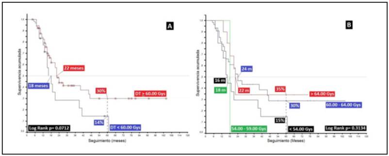 With regard to treatment with RT, it should be noted that this modality has contributed greatly to final patient outcomes, with an increase in median survival of 2, 9 and 6 months for patients treated comparatively with Sx, Sx+RT, Sx+CT/RT and Stupp, respectively (p=0.0000), similar to other studies 4,17. A four-month improvement was also shown in the median (18 vs. 22 months) and 16% (14 vs. 30%) in five-year survival in favor of doses greater than 60.00 Gys (p=0.0712), with even greater differences when analyzed by total dose less than 54.00 / 54.00-59.00 / 60.00-64.00 and greater than 64.00 Gys, with 60.0 Gys being established as the standard minimum dose for this disease, with similar results to others and survival differences which increase as the dose increases (p=0.3134) 27,28 (Figure 6).