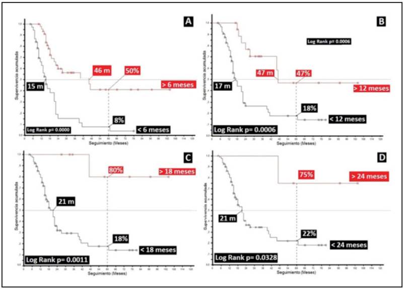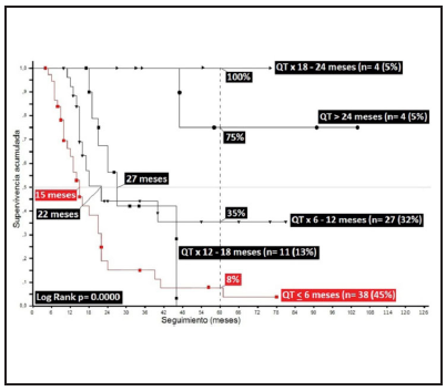 An analysis of the data from less than six months, 6-12, 12-18 and 18-24 months, and greater than 24 months shows the same tendency, with each of the periods favoring the group with a greater length of adjuvancy, with the following differences beginning at less than or equal to six months: 27% compared to 6-12 months, 92% compared to 18-24 months and 67% compared to more than 24 months. This was also true for median survivals in the same analysis, beginning with differences between the group with the shortest period and its subsequent seven-month (<6 vs 6-12 months) and five-month (12 vs. 18 months) analysis, without being able to establish the difference vis-à-vis 18 months on as the median survival had not been reached, with all the data being statistically significant (p=0.0000) (Figure 8).