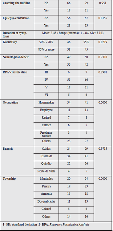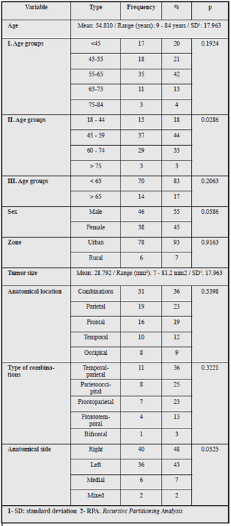 Eighty-four patients were treated with the standard multimodal regimen of Sx+CT/RT+adjuvant CT (Stupp platform). The mean age was 54.8 years, 83% were under the age of 65, 55% were males, 41% were homemakers, and 93% were urban. The mean tumor size was 28.79 mm2, with 23 located in the parietal lobe and 36% having anatomical combinations, 36% of which were temporal-parietal; 48% were on the right side, and 21% crossed the midline. Thirty-three percent of the patients had had prior convulsions with a mean duration of symptoms of 3.45 months; 45% had a Karnofsky greater than 80%; 42% had a prior neurological deficit; 79% received a partial resection; 45% had post-surgical radiological follow up; 76% had tumor recurrences, 65% of which were classified as persistence, with 36% being treated with temozolamide-based CT; 27% had RPA V-VI; 24% were from Manizales and 23% from Pereira, and, in general, temozolamide was used for an average of 10.643 months (Table 1).