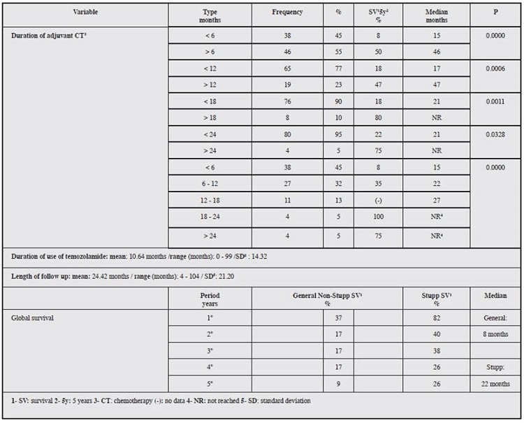 Conclusion: a clear increase in survival is shown with adjuvant temozolamide for periods longer than six months, as well as a tendency towards better results with increased duration of adjuvance.