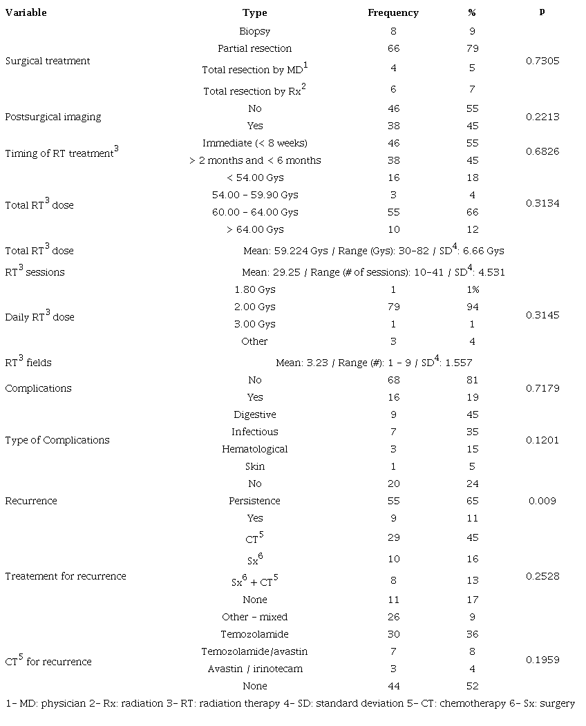 From a surgical standpoint, the standard treatment (Sx+CT/ RT+CT) was performed with partial resection (PRes) and biopsy (Bx) in 88%. Radiation therapy was given in 55% of cases before eight weeks, with a total mean dose of 59.22 Gys and a mean of 29.2 sessions, with 94% receiving 2.00 Gys/ day five times per week; there was a mean of 3.23 fields with 23% receiving a dose less than 60.00 Gys.