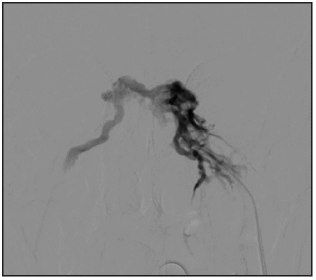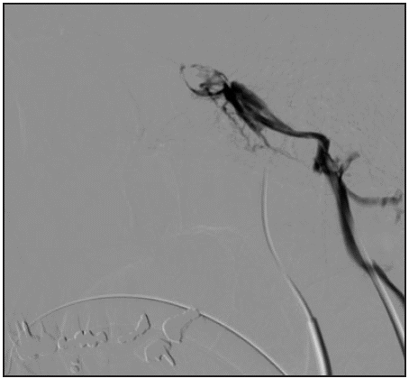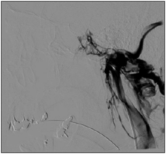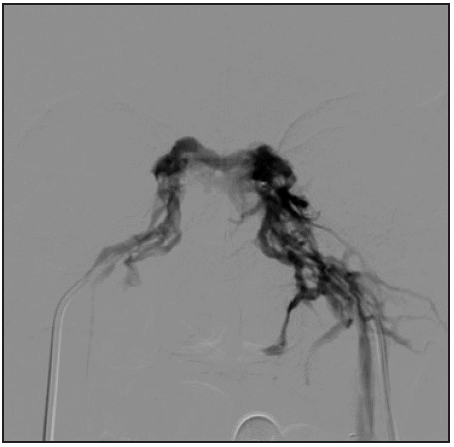 Once phlebography confirmed appropriate positioning of the catheters (Figure 2b), baseline samples were taken from both petrosal sinuses and from the right femoral access site. Femoral access catheterization was not possible in two cases; left basilic vein access was used in one case, and left jugular access in the other, with 5 Fr (Boston) introducers. After the baseline samples were obtained, a 10.5 µg bolus of desmopressin (diluting a 15 µg/mL ampule from 1 cc to 10 cc and administering 7 cc intravenously) was injected through the peripheral access, in place of CRH, due to availability and costs. Following this, samples were taken from the femoral, basilic or jugular access and from both petrosal sinuses 3, 5 and 10 minutes after the stimulation. The samples were immediately placed in previously marked EDTA-containing tubes which had been previously marked and separated by sampling times, to facilitate safe sampling and packaging to avoid mixing up the samples. They were then transported to the laboratory through a cold chain for safe and effective processing the same day of the sampling.