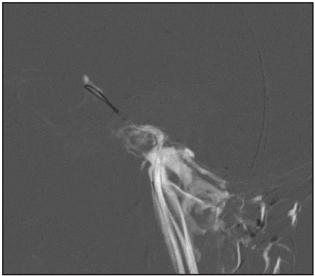 All the cases were done using only venous access, except for one case in which diagnostic arteriography was performed to adequately identify the petrosal sinuses. Altogether, 90.9% of the cases (20 patients) were done exclusively through femoral venous access; in one case, left basilic vein access was needed and in another case left jugular access was needed, due to a more favorable anatomy for the catheterization.