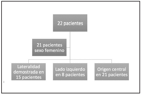 The procedure was performed on an outpatient basis in all cases, with no immediate complications recorded. All the procedures were carried out under general anesthesia and over a period of seven years: 22 selective catheterizations of the petrosal sinuses to determine ACTH levels. A central source was proven in 95.4% of cases. Of these 22 cases, 95.4% were female and 4.6% were male (Figure 3). Table 1 gives an example of the interpretation of the test results, and Table 2 shows the results. The average age was 43.3 years, with a range from 19 to 69 years. An intersinus ratio greater than 1.4 to prove laterality was shown in 68.2% of cases. In the cases in which laterality was proven, there was a tendency towards left laterality in 53.3% of the results. The mean laterality ratio was 32.7, with a range of 1.6-288.0.