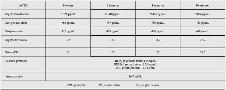 Despite being an invasive procedure, petrosal sinus venous sampling has a very low complication rate. The literature records up to 4% which are due to the puncture 45. Very rare cases of thrombosis, transient venous hypertension with pontine involvement, pulmonary embolism, transient sixth cranial nerve palsy, and subarachnoid hemorrhage have also been described 46. In our study, we chose to perform the procedure under general anesthesia as this facilitates the test and keeps the catheters from being shifted, for appropriate sampling. It should be highlighted that venous catheterizations are safer than arterial ones; we only used an arterial access in one case (3.7%), which minimizes the probability of complications. There were no immediate complications in our study.
