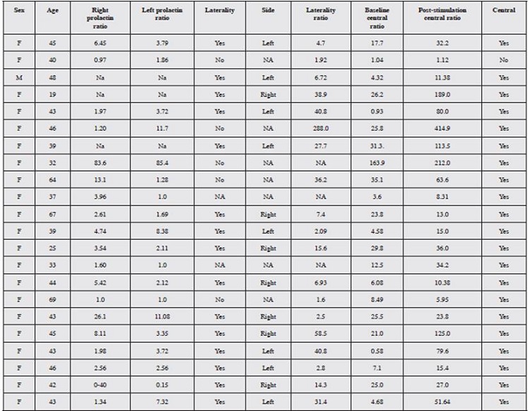 The baseline central/peripheral ratio by which 95.4% of the cases were proven was 21.7, on average, and 70.8 after stimulation. The diagnosis was able to be reached with the baseline samples alone in 17 patients (77.3%), and in 21 patients (95.4%) after stimulation, which means that 18.1% more patients with central production were diagnosed following desmopressin administration. In only one case was central production not able to be proven by this method, and in another case, the laboratory did not specify the laterality of the sample, but did prove the central source.