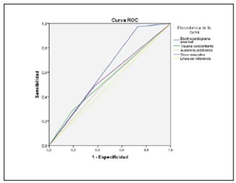 Se realizó una selección de variables que constituyeran factores de riesgo asociados a estos desenlaces graves a 10 días para ingresar a un modelo de regresión logística, que en una exploración de asociación obtuvieran una significancia estadística menor o igual a 0.05. El modelo de regresión logística mostró que el electrocardiograma anormal (OR 13.98, IC 95% 1.29-151.9) y el trauma concomitante (OR 5.22, IC 95% 1.20-22.67) tuvieron significancia estadística en la predicción de eventos adversos. El resto de los factores como edad mayor de 65 años (OR: 2.20; IC: 0.72-6.7) , sexo masculino (OR: 1.2; IC 0.39-3.69), la presencia de falla cardiaca (OR: 1.92; IC: 0.45-8.16), enfermedad arterial periférica (OR: 2.17; IC: 0.27-17.34), enfermedad renal crónica (OR: 2.46; IC: 0.41-14.7), accidente cerebrovascular (OR: 0.69; IC: 0.02-20.48), cardiopatía (OR: 3.16; IC: 0.62 - 16.09) arritmia (OR: 5.41; IC: 0.32-91.46), síncope previo (OR: 0.57; IC: 0.17-1.95), colocación de marcapasos (OR: 0.19; IC: 0.00-10.15), colocación de CDI (OR: 0.29; IC: 0.01 - 18.93) y ausencia de pródromos (OR: 0.86, IC: 0.29 - 2.59) no mostraron el mismo comportamiento.
