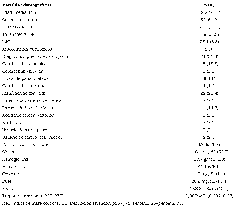 Se incluyeron 98 pacientes en total, la edad promedio de la población fue 63±21 años y el 60.2% (n=59) eran mujeres. Las características demográficas, clínicas y de laboratorio se encuentran en la Tabla 1. El 36.7% (n=36) de la población tenía antecedente de síncope. Para el 31.3% (n=30) éste había ocurrido en los seis meses anteriores al ingreso. Doce pacientes tuvieron más de un episodio de síncope en los seis meses previos.