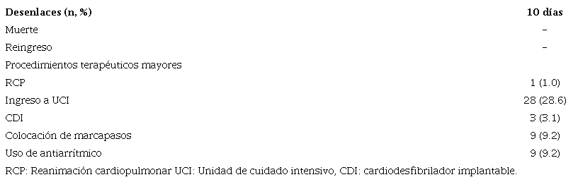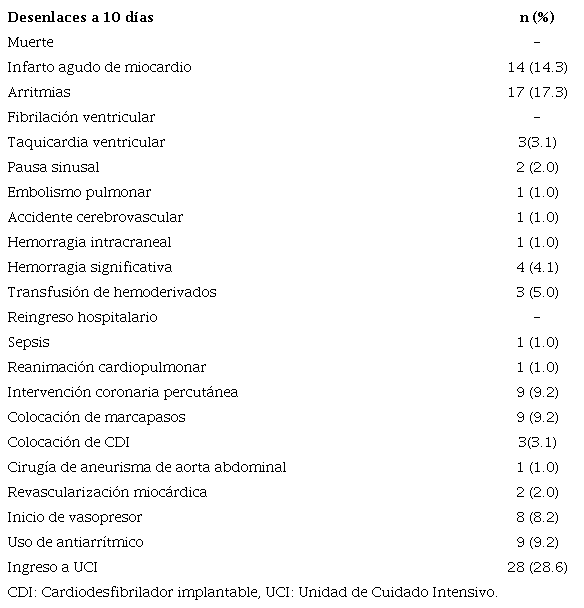 La descripción de la incidencia de los desenlaces generales a 10 días del evento se describe en la Tabla 2. Traslado a UCI, presencia de arritmias e infarto agudo de miocardio fueron los más frecuentes (28.6, 17.3 y 14.3% respectivamente).