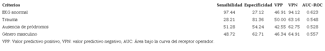 Los criterios evaluados por la regla de predicción STePS se comportaron de la siguiente forma: la presentación de anormalidades en el electrocardiograma fue el criterio más frecuente (82.7%), seguido por la ausencia de pródromos (48%), género masculino (41.8%) y presencia de trauma asociado (22.4%) en orden de frecuencia.