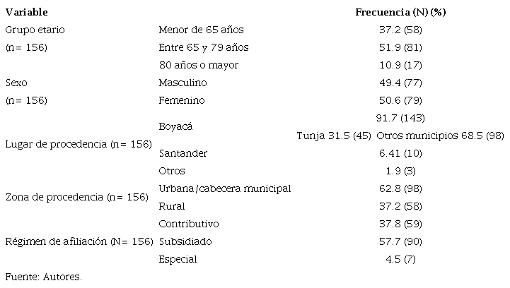 Se identificaron en el registro físico un total de 166 pacientes que recibieron trombólisis por diagnóstico de ACV isquémico en la E.S.E Hospital San Rafael de Tunja entre el 1°. de enero de 2014 y el 30 de junio de 2019. Se excluyeron tres pacientes por haber sido trombolizados por telemedicina, dos pacientes por tener historias clínicas incompletas y cinco pacientes porque sus historias clínicas no estaban disponibles en la oficina de estadística y archivo de la institución. La población final incluida fue de 156 pacientes: 24 del año 2014, 30 del 2015, 35 del 2016, 29 del 2017, 22 del 2018 y 16 del 2019.