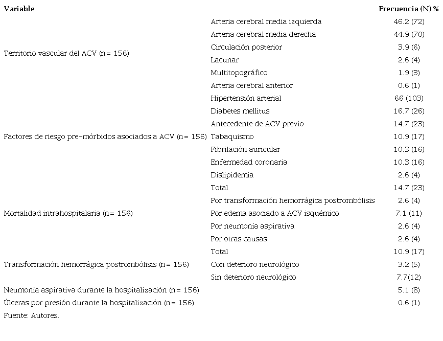 Se tomaron las principales características sociodemográficas de la población, la prevalencia de los factores de riesgo cardiovascular premórbidos, las variables clínicas asociadas al evento de ACV [territorio vascular del ACV, tiempo de estancia hospitalaria, tiempo desde inicio de los síntomas-llegada al centro hospitalario, tiempo hasta valoración por terapia física, puntaje National Institute of Health Stroke Scale (NIHSS) 8 al ingreso], los desenlaces intrahospitalarios de los pacientes (mortalidad intrahospitalaria y puntaje NIHSS al egreso), las complicaciones intrahospitalarias más relevantes (transformación hemorrágica, neumonía aspirativa y úlceras por presión) y los indicadores de calidad del programa de trombólisis (tiempo puerta-aguja y puerta-imagen).