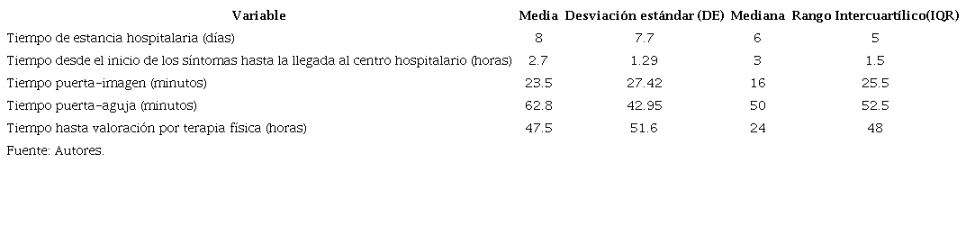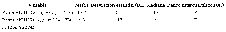 Resultados: se incluyeron 156 pacientes. La edad promedio fue de 66.1 años y 50.6% fueron mujeres. Sólo 28.8% provenían de Tunja. La hipertensión arterial fue el factor de riesgo más prevalente. El tiempo promedio de estancia fue de ocho días (DE 7.7) y el tiempo promedio de ventana fue de 2.8 horas (DE 1.29). El puntaje NIHSS promedio de ingreso fue 12.4 (DE 5) y el de egreso de 4.8 (DE 4.48). La tasa de mortalidad intrahospitalaria fue 14.7% y la tasa de transformación hemorrágica de 10.9%. El tiempo puerta-aguja promedio fue de 62.8 minutos (DE 42.95) y el tiempo puerta-imagen promedio de 23.5 minutos (DE 27.42).