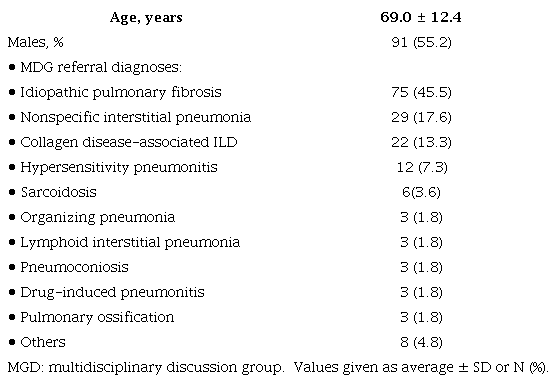 A total of 165 patients with ILD were included, 55.2% of whom were males, with an average age of 69.0 ± 12.4 years. The frequency of the MDG referral diagnoses is shown in Table 1.