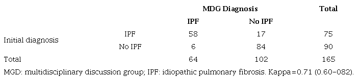 out of 165 patients with ILD, the diagnosis was changed in 32.5%. The MDG confirmed IPF in 77.3% of patients with an initial diagnosis of ILD and 6.7% of those with a different initial diagnosis. When IPF was ruled out, the main diagnoses were chronic hypersensitivity pneumonitis (24.8%) and nonspecific interstitial pneumonia (23.5%). The Kappa index between the initial and final IPF diagnoses was 0.71 (0.60-0.82).