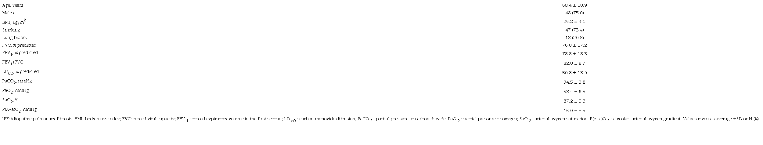 Patients with a final MDG diagnosis of IPF were mostly males (75.0%) with a history of smoking (75%). A pul monary biopsy was performed on 13 of these 64 patients (20.3%). Functionally, they had decreased forced vital capacity and carbon monoxide diffusion, hypoxemia and a high alveolar-arterial oxygen gradient (Table 3).