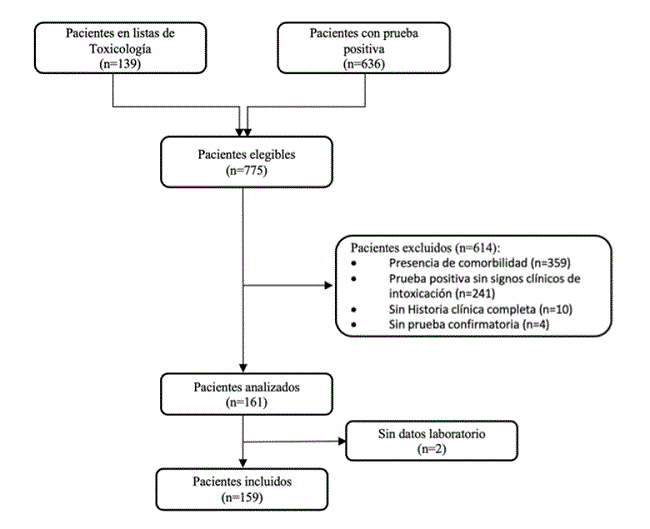 A total of 139 patients who were seen by the toxicology service were found, and 636 patients had a positive cocaine test, for a total of 775 eligible patients. Altogether, 614 were excluded, most due to having other intoxications or comorbidities, with 159 patients ultimately included (Figure 1).