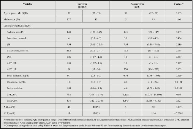 Six patients died during the hospital stay (3.8% mortality; 95% CI 1.4-8.0%). Their ages ranged from 32 to 38 years, and they were tachycardic and desaturated on admission, with increased transaminases, creatinine and CPK (five had CPK >1,000) and decreased levels of bicarbonate (Table 2). Concomitant alcohol ingestion was recorded for three patients and THC for two. In these cases, the complications were AKI coupled with ALF (n=5, 83.3%) and CVA (n=1; 16.7%).